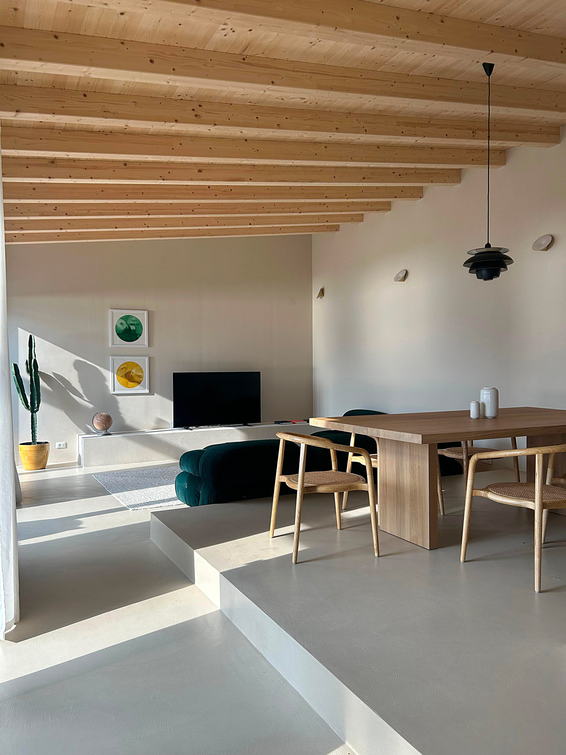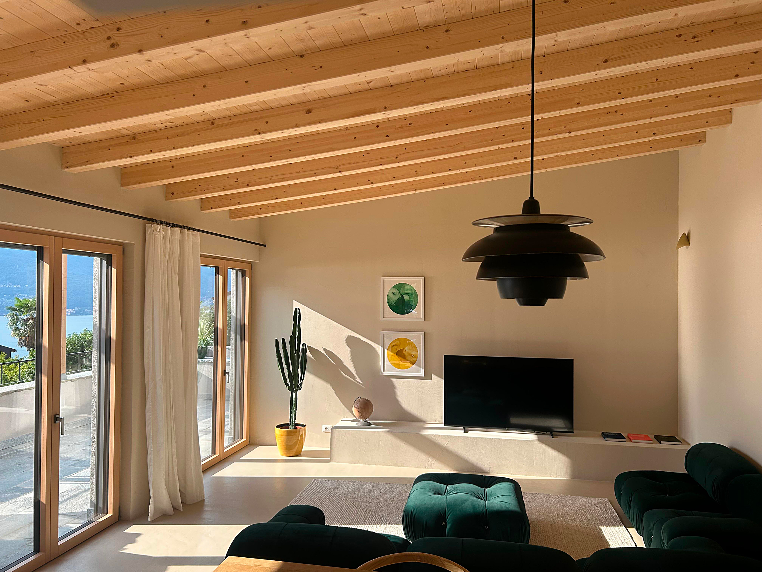 I piani sfalsati a differenti altezze organizzano lo spazio e ne definiscono le funzioni, senza mai interrompere la continuità visiva. Una scelta progettuale che amplifica la sensazione di ampiezza e accompagna lo sguardo verso l’esterno.